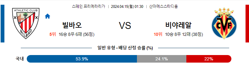 [킹콩티비] 04월 15일 빌바오 vs 비야레알 라리가 생중계, 스포츠분석,스포츠중계