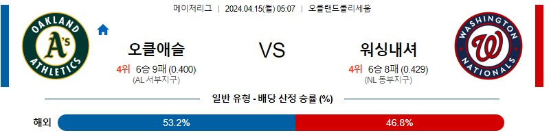 [킹콩티비] 04월 15일 오클랜드 vs 워싱턴 MLB 생중계, 스포츠분석,스포츠중계