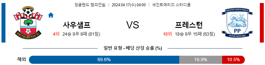 [킹콩티비] 04월 17일 사우스햄튼 vs 프레스턴 챔피언쉽 생중계, 스포츠분석,스포츠중계