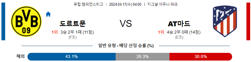 [킹콩티비] 04월 17일 도르트문트 vs AT마드리드 유럽챔스 생중계, 스포츠분석,스포츠중계