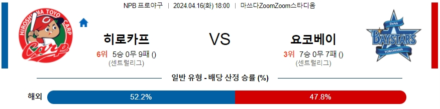 [킹콩티비] 04월 16일 히로시마 vs 요코하마 NPB 생중계, 스포츠분석,스포츠중계