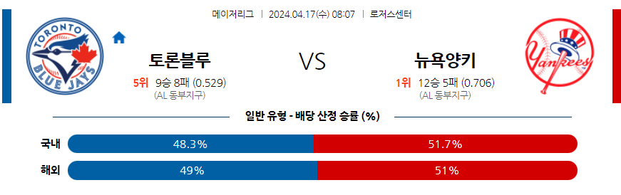 [킹콩티비] 04월 17일 토론토 vs 뉴욕양키스 MLB 생중계, 스포츠분석,스포츠중계