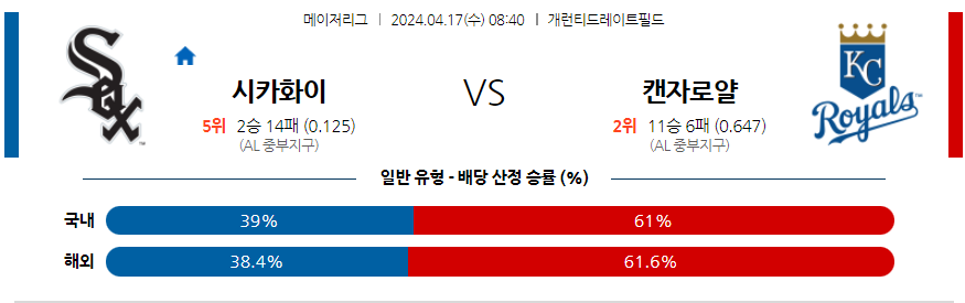 [킹콩티비] 04월 17일 시카고W vs 캔자스시티 MLB 생중계, 스포츠분석,스포츠중계