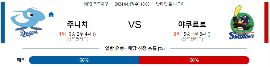 [킹콩티비] 04월 17일 주니치 vs 야쿠르트 NPB 생중계, 스포츠분석,스포츠중계