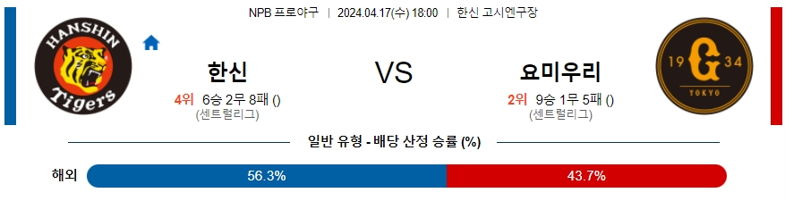 [킹콩티비] 04월 17일 한신 vs 요미우리 NPB 생중계, 스포츠분석,스포츠중계