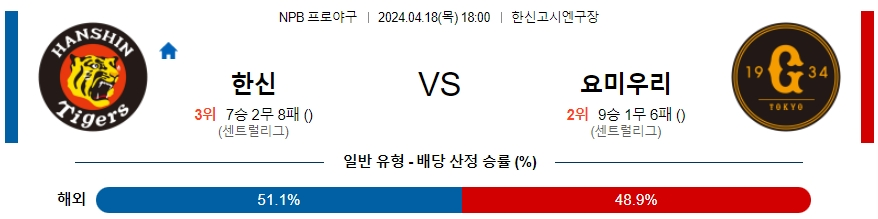 [킹콩티비] 04월 18일 한신 vs 요미우리 NPB 생중계, 스포츠분석,스포츠중계