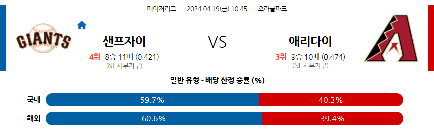 하지만 애리조나가 불펜에 약점이 심각한 반면 샌프란시스코는 불펜이 나름 탄탄한 편이고 후반 경기력도 더 좋다.