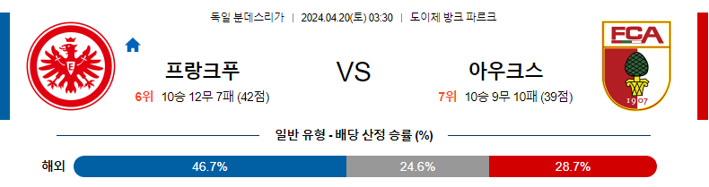언더(2.5) 양상의 무승부를 기대해보는 매치다. 프랑크푸르트가 일단 순위를 지키기 위해서 상당히 수비적으로 나설 가능성도 높을 것. 다행히 홈에서는 프랑크푸르트의 수비가 아주 큰 흠이라고 보기는 어려울 것이고, 패스를 그냥 두고 보지만은 않는 전력이라서, 아우크스부르크도 프랑크푸르트를 상대로는 꽤 까다로움을 느끼던 편이었다.