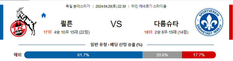 [킹콩티비] 04월 20일 쾰른 vs 다름슈타트 분데스리가 생중계, 스포츠분석,스포츠중계