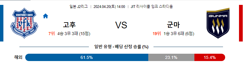 고후가 이길 것으로 본다. 두 팀을 비교하면, 아무래도 공격에서 신뢰를 보낼 수 있는 팀은 고후라고 할 수 있을 듯. 물론 고후도 올 시즌 공격 횟수나 기복이 조금 보이고 있는 상태이기는 한데, 그래도 오픈한 전개에서의 능력을 지난 경기에서 보여주기도 했고, 군마가 적극성을 보여주는 팀에게는 수비나 공격이나 모두 좋은 평가를 해주기는 어렵다.
