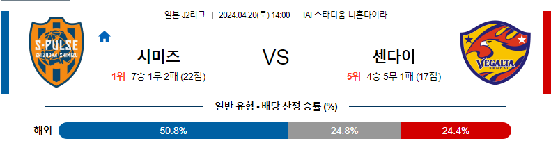 시미즈의 우세를 기대해보는 매치. 시미즈가 센다이의 강한 압박과 실리적인 움직임에 대응이 안되는 모습은 아니었다. 되려 홈에서는 경기 점유와 지배력을 늘려서, 수비와 공격 사이의 밸런스를 잘 맞추는 유형. 화력싸움으로 간다면 공격 횟수가 부족한 센다이가 불리할 가능성이 높다.