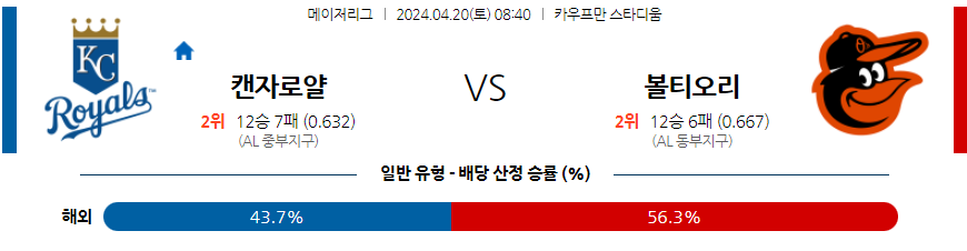 [킹콩티비] 04월 20일 캔자스시티 vs 볼티모어 MLB 생중계, 스포츠분석,스포츠중계