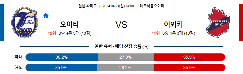 이와키의 승리를 기대한다. 결국 골을 기록할 수 있는 상황을 잘 만드는 쪽의 손을 들어주는 것이 합당할 것. 상대가 적극적으로 나서는 상황에서는 이와키가 수비에서 흔들리는 시퀀스가 있을 수 있다고 해도, 오이타가 적극적으로 상대와 맞불을 놓는 전력이라고 보기는 어려울 것으로 본다.