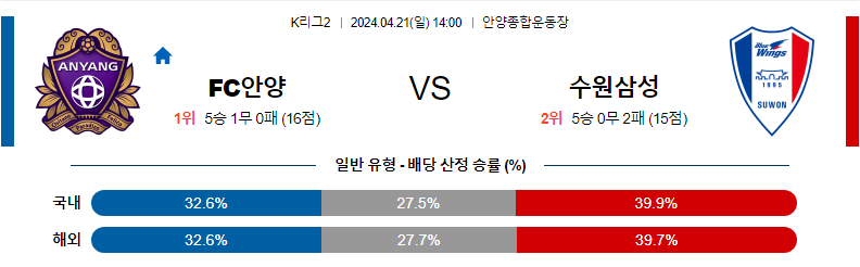 수원삼성에게는 2022년 승강플레이오프에서 패퇴하는 등, 아픔의 역사가 짙다. 다만 올 시즌 보여주는 경기력에서는 안양이 상당히 우위. 물론 K리그2의 실정에 맞게 상당히 보수적으로 가면서 역습을 가는 편이지만, 올 시즌 10위의 슈팅 횟수에도 4위의 유효슈팅을 기록하는 등, 외인과 토종 공격수들의 성적이 골고루 좋은 상황이라고 할 수 있을 듯.