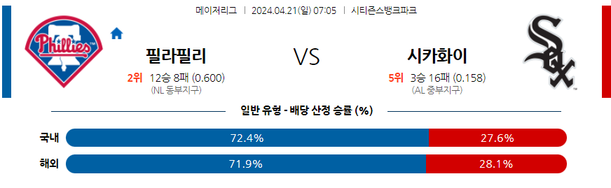 [킹콩티비] 04월 21일 필라델피아 vs 시카고W MLB 생중계, 스포츠분석,스포츠중계