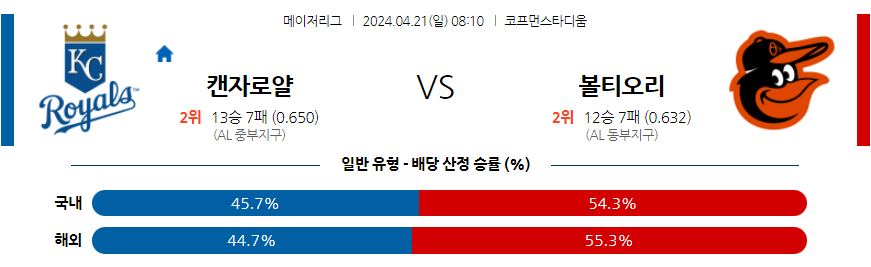 [킹콩티비] 04월 21일 캔자스시티 vs 볼티모어 MLB 생중계, 스포츠분석,스포츠중계
