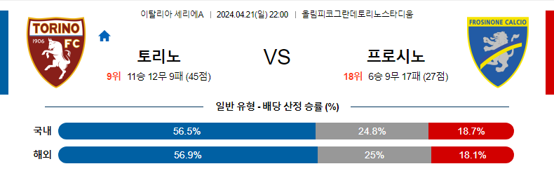 [킹콩티비] 04월 21일 토리노 vs 프로시노네 세리에A 생중계, 스포츠분석,스포츠중계
