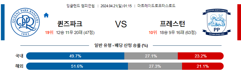 [킹콩티비] 04월 21일 퀸즈파크레인저스 vs 프레스턴 챔피언쉽 생중계, 스포츠분석,스포츠중계