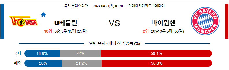 [킹콩티비] 04월 21일 우니온 vs 바이에른뮌헨 분데스리가 생중계, 스포츠분석,스포츠중계