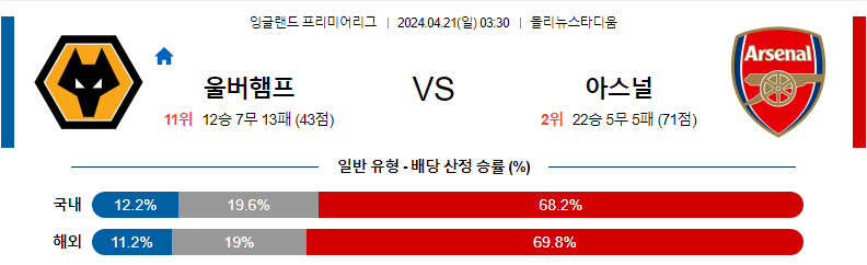 아스날이 여전히 유리한 상황으로 보기는 하고 있다. 다만 최근 측면 수비에 대한 문제를 너무 크게 드러내고 있는 상황. 리그와 UCL모두 측면 수비 떄문에 망쳤다고 해도 과언은 아니었다. 울브스가 한 골 정도는 측면을 경유한 역습으로 기록할 수 있을 것으로 본다. 오버(2.5)를 부주력으로 픽하는 것을 추천.