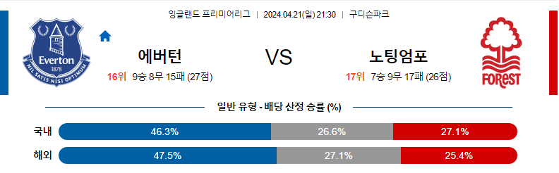 무승부를 기대해보는 매치. 일단 에버튼도 노팅엄을 확실하게 제압할만한 오픈플레이에서의 득점력이 모자란 편이고, 노팅엄도 후반전 상황에서의 경기력 유지 능력을 아주 신뢰하기는 어려울 듯 하다. 물론 노팅엄도 에버튼 상대로 전방위적인 압박의 약점을 이용하는 것 정도는 생각해볼 수 있는 방안.