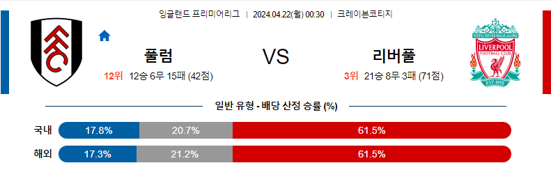 냉정하게 리버풀이 힘든 게임이 될 것으로 볼 수도 있을 것. 과감하게 무승부를 픽하는 것도 방법이겠다. 물론 오버(3.5)를 픽하는 것이 가장 1순위. 풀럼이 맞불을 놓으면서 리버풀의 간담을 서늘하게 만든 사례도 다수 있었다. 리버풀 선수들이 결정력을 발휘하면서 풀럼을 상대로 밀리지는 않는 모습이나, 풀럼이 아주 역습이 만만한 팀은 아니다.