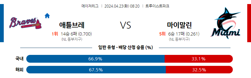 [킹콩티비] 04월 23일 애틀랜타 vs 마이애미 MLB 생중계, 스포츠분석,스포츠중계