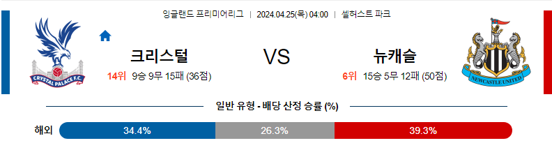 오버(2.5) 양상에서 무승부를 기록하는 것을 생각하고 있는 매치다. 폭발력이 슬슬 올라오고 있는 팰리스. 뉴캐슬을 상대로 노쇠화된 수비진과 넓은 공간을 활용하는 양상을 기대할 여지는 큰 것으로 보인다. 그나마 팰리스도 뉴캐슬과 비슷하게 수비 상황에서 페이스가 90분 내내 이어지고 있는 상황이 아니라는 점을 약점으로 들 수는 있을 것.