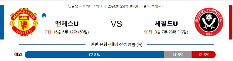 오버(3.5) 양상에서 맨유가 승리하는 것을 기대한다. 일단 맨유가 하위권 팀을 상대로도 슈팅 억제나 수비에서 별다른 모습을 보여주지 못하고 있는 상황. 셰필드가 득점력에서 어느 정도는 비벼볼 수 있을 것 같다. 그나마 맨유가 선수들의 개인 기량으로나마 생산력을 유지하고 있다는 점에서는 점수를 줄 수 있는 정도다.