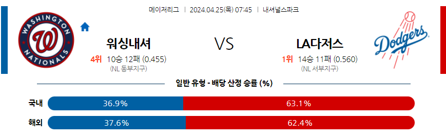 [킹콩티비] 04월 25일 워싱턴 vs LA다저스 MLB 생중계, 스포츠분석,스포츠중계