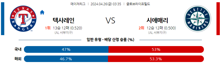 [킹콩티비] 04월 26일 텍사스 vs 시애틀 MLB 생중계, 스포츠분석,스포츠중계