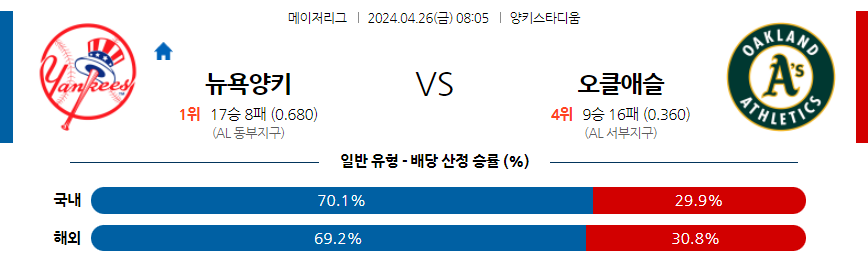 [킹콩티비] 04월 26일 뉴욕양키스 vs 오클랜드 MLB 생중계, 스포츠분석,스포츠중계