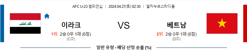 오버(2.5) 양상에서 이라크가 승리하는 것을 생각하고 있는 매치다. 일단 이라크가 신체 능력이나 기본적인 경합 상황에서 우위를 잡을 것으로 보고 있다. 물론 보여준 수비력에 대해서는 이라크도 높은 평가를 받기는 어려울 것으로 보이기는 한데, 오픈플레이 상황에서 베트남의 골 기록에서 운이 좀 따라주었던 것은 부정하기 어려울 듯 하다.