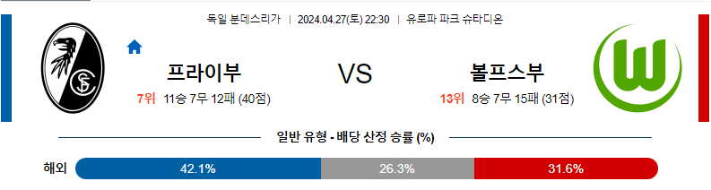[킹콩티비] 04월 27일 프라이부르크 vs 볼프스부르크 분데스리가 생중계, 스포츠분석,스포츠중계