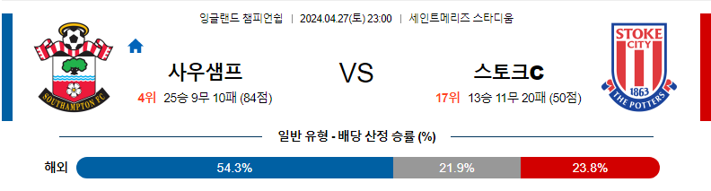 [킹콩티비] 04월 27일 사우스햄튼 vs 스토크 챔피언쉽 생중계, 스포츠분석,스포츠중계