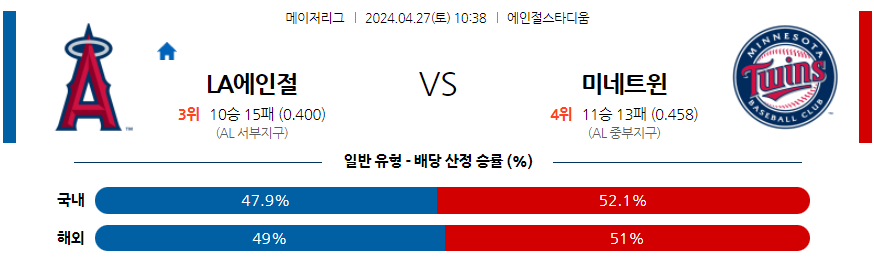[킹콩티비] 04월 27일 LA에인절스 vs 미네소타 MLB 생중계, 스포츠분석,스포츠중계