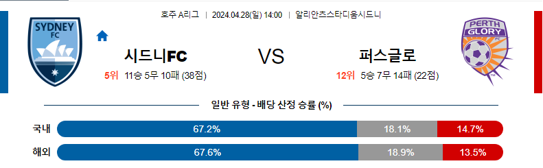시드니의 우세를 유력하게 보고 있다. 결국 홈에서 보여주는 시드니의 안정성을 생각해야 하고, 무엇보다도 퍼스글로리가 공격을 위해서 희생하고 있는 수비 안정성이 너무 치명적이다. 시드니가 어느 정도 실점을 통제하는 퍼포먼스를 보여준다면, 기복이 적은 공격진이 상대 수비진을 타격하는 것으로 응답할 것.