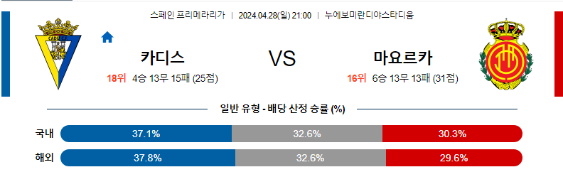 [킹콩티비] 04월 28일 카디스 vs 마요르카 라리가 생중계, 스포츠분석,스포츠중계