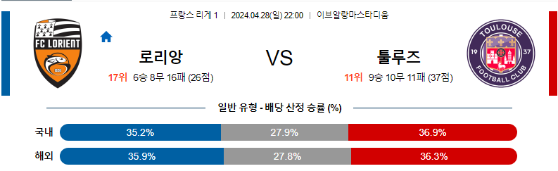 [킹콩티비] 04월 28일 로리앙 vs 툴루즈 리그1 생중계, 스포츠분석,스포츠중계