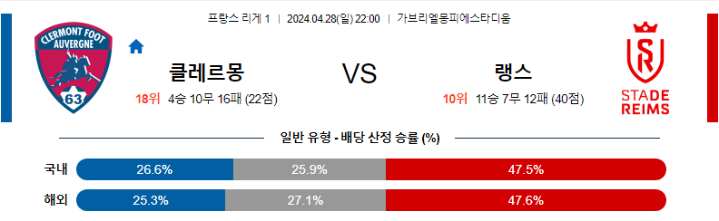 [킹콩티비] 04월 28일 클레르몽 vs 랭스 리그1 생중계, 스포츠분석,스포츠중계