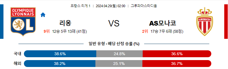 [킹콩티비] 04월 29일 리옹 vs AS모나코 리그1 생중계, 스포츠분석,스포츠중계