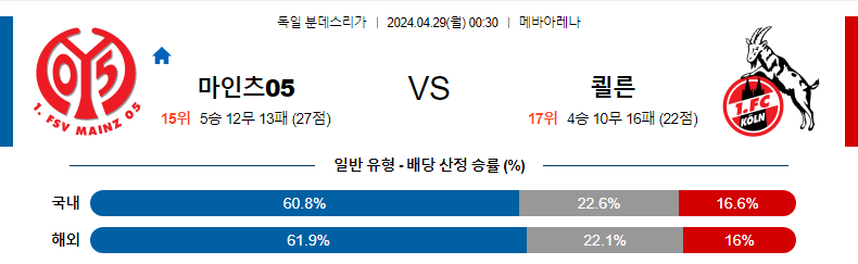 [킹콩티비] 04월 29일 마인츠 vs 쾰른 분데스리가 생중계, 스포츠분석,스포츠중계