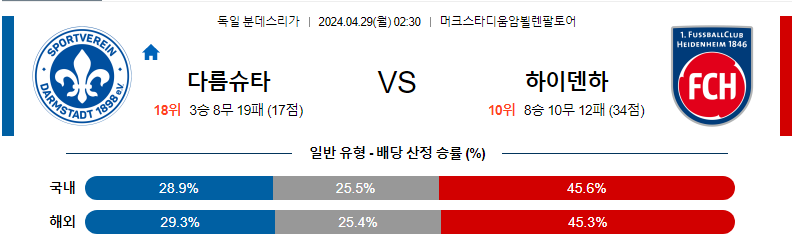 [킹콩티비] 04월 29일 다름슈타트 vs 하이덴하임 분데스리가 생중계, 스포츠분석,스포츠중계