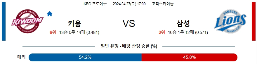 최근의 삼성은 투타의 조화가 상당히 훌륭한 팀이다. 반면 키움은 타격쪽에 문제를 일으키는 중. 하지만 후라도는 홈에서 삼성의 타선을 제어할수 있는 투수고 지금의 코너는 외인 선발로서의 기대치를 채우지 못하는 중이다. 키움의 불펜이 변수가 될수 있지만 패하는 경기에서의 삼성 불펜도 신뢰는 어렵다. 선발에서 앞선 키움이 승리에 가까이 있다.