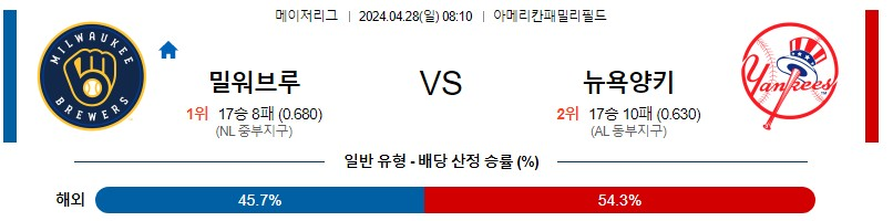 [킹콩티비] 04월 28일 밀워키 vs 양키스 MLB 생중계, 스포츠분석,스포츠중계