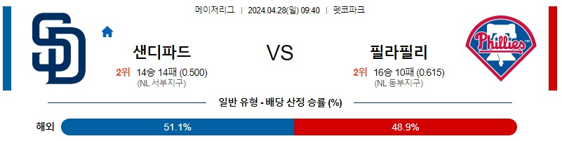 타선의 힘을 앞세워 연승에 성공한 필라델피아 필리스는 레인저 수아레즈(4승 1.36)가 시즌 5승 도전에 나선다. 23일 신시내티 원정에서 7이닝 2안타 무실점 승리를 거둔 수아레즈는 최근 3경기에서 22이닝 11안타 무실점의 완벽투가 이어지는 중이다. 작년 샌디에고 상대로 홈에서 6이닝 3실점 투구를 보여주었는데 앞선 등판이 피츠버그, 콜로라도, 신시내티였음을 감안한다면 이번 경기가 시험대가 될 전망이다. 전날 경기에서 머스그로브와 크로스그로브를 공략하면서 홈런 5발 포함 9점을 올린 필라델피아의 타선은 원정 공격력이 놀라울 정도. 특히 경기 중후반에 집중력이 떨어지지 않는다는게 무서울 정도다. 놀라의 8이닝 투구 덕분에 불펜 소모를 1명으로 마무리한것도 다행스러운 부분.