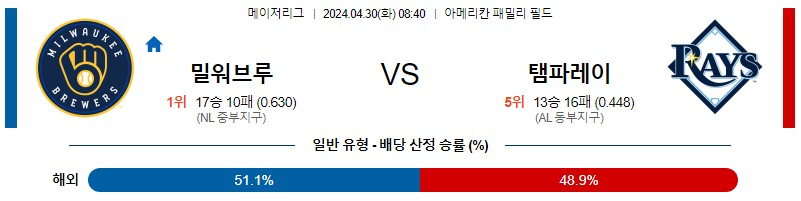 [킹콩티비] 04월 30일 밀워키 vs 템파베이 MLB 생중계, 스포츠분석,스포츠중계