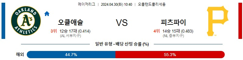 [킹콩티비] 04월 30일 오클랜드 vs 피츠버그 MLB 생중계, 스포츠분석,스포츠중계