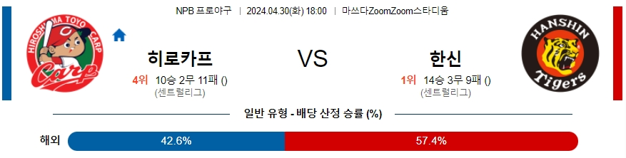[킹콩티비] 04월 30일 히로시마 vs 한신 NPB 생중계, 스포츠분석,스포츠중계