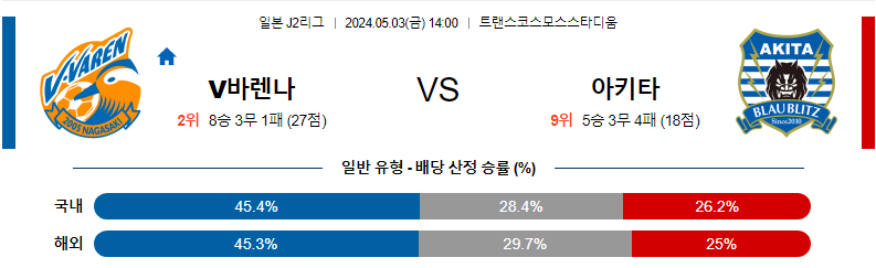 나가사키가 신승하는 가능성을 높게 보고 있다. 일단 아키타다 블록을 세운 상황에서는 안정적으로 실점을 커버하는 면모가 없지는 않다. 하지만 아키타가 공을 잡은 상대의 패스를 잘 제어하지 못하는 면모가 강했던 것이 사실. 득점력이 부족한 아키타 입장에서는 이 상황에서 불리한 위치에 있을 가능성이 높다.